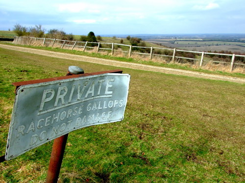 White Hill is the best spot and also the easiest to access. On the west side of the road are two bowls that face northeast. Flyers use the second bowl. The area is not as high as the slopes on the South Downs but there is clear countryside for miles in front so the lift is good. Landing opportunities are reasonable. There is a fence behind the flying area to keep walkers off the racehorse gallops, so try not to land back there. Gliders should not be flown when racehorses are being exercised in the area (although the horse riding often takes place too early in the morning to affect glider flyers).